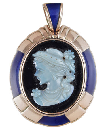 Gold 585, Onyxcamee, Damenporträt geschnitten aus Achat, tlw. mit kobaltblauem Email, handgefertigt, 45x37mm, 21g;